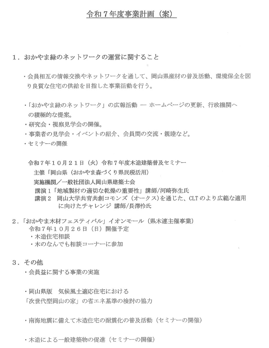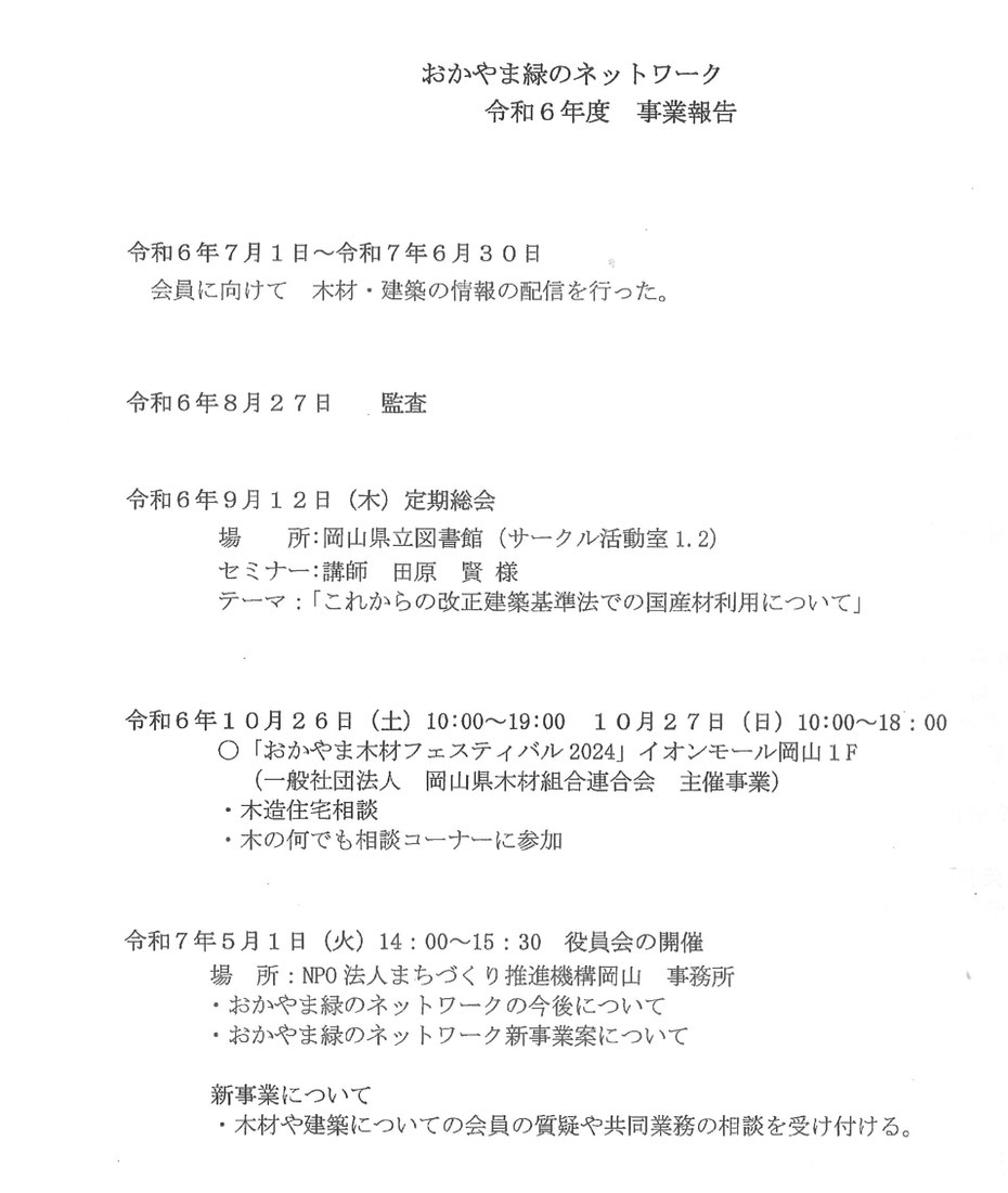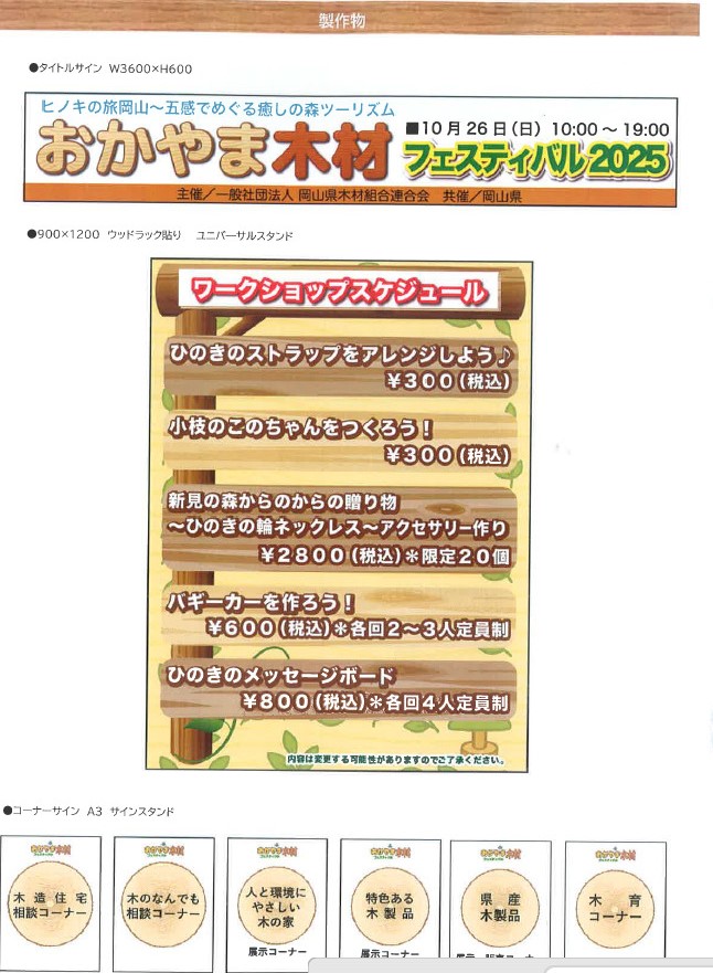 令和7年度10月26日(日)イオンモール岡山1F未来スクエアにて「おかやま木材フェスティバル2024」が岡山県木材組合連合会主催で開催され、岡山県産材による木製品・木工芸品等の展示・販売しました。「おかやま緑のネットワーク」は、今年も木造住宅や木の何でも相談コーナーを設営しました。
